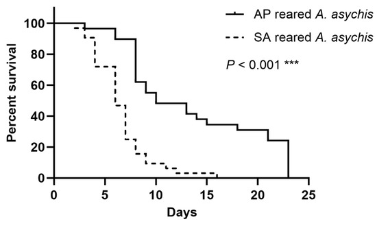 Percent survival of A. asychis emerging from A. pisum (AP-reared A. asychis) and S. avenae (SA-reared A. asychis) at 25 °C. *** means p < 0.001.