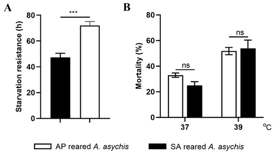 Fifty newly emerged female adults of A. asychis (S. avenae and A. pisum) were separately transferred into a PCR tube, as described above. For starvation tolerance experiments, all of the PCR tubes containing A. asychis were kept under rearing conditions without access to aphid, water or plant. In this experiment, each female was treated as a biological replicate. For the thermal tolerance experiment, PCR tubes with A. asychis were placed into an electronic incubator at two high temperatures (37 and 39 °C) for 1 h, respectively [27,28]. One hour later, the number of surviving adults was recorded. Each treatment had three biological replicates, and the per biological replicate contained 30 female adults.