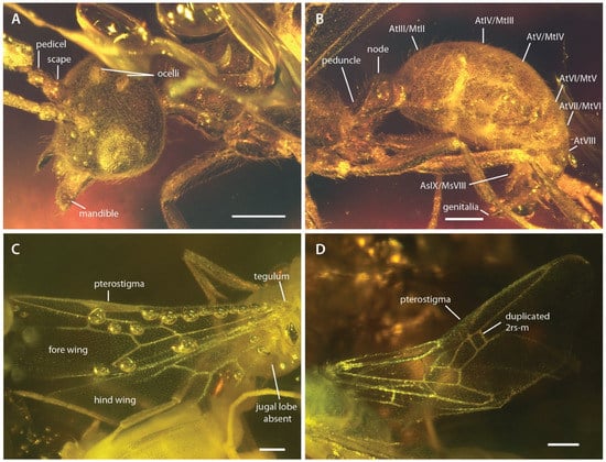 To reduce the light scattering of the sample, a drop of water was applied to the amber surface of interest and covered with a glass coverslip. The figured microphotographs are digitally stacked composites obtained using Helicon Focus software, from up to 70 source images taken with Leica Application Suite software on a Leica M205 C stereomicroscope equipped with a Leica DMC4500 digital camera. The resulting images were then enhanced using Photoshop CC 2019 software. Additional images of male mandibles from various ant subfamilies are from AntWeb [].