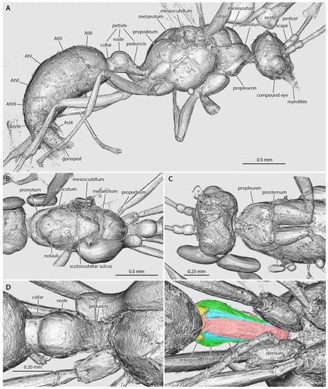 During the past two decades of contemporary myrmecological systematics, the field has been transformed by a wave of Sanger-based phylogenetic studies (e.g., [,,]) followed by a wave of transcriptomic and reduced-enrichment phylogenomic studies (e.g., [,]). These genetic and genomic works, informed by the morphological system, have proved to be a catalyst for the reevaluation of evolutionary and taxonomic patterns of ant phenotypes across the phylogeny, from the species to the family level. Although fossils are critical for understanding the diversification and disparification of extant lineages (e.g., [,]), these critical specimens cannot be sequenced, thus their biological information remains challenging to capture meaningfully. In analogy to molecular methodology, the study of phenotype was enhanced since the new millennium by readily accessible microphotography rigs and digital image stacking programs, while the phenomic transformation of the field will soon to be realized via desktop and synchrotron micro-computed tomography (µ-CT and SR-µ-CT, [,,]; e.g., [,,,]).