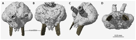 Volume renders of the segmented data from the head of †Desyopone hereon gen. et sp. nov., holotype MAIG 6016, showing the highly unusual mandibles. (A) full-face view; (B) ventral view; (C) dorsolateral anterior oblique view; (D) oral view. Scale bar approximate due to slightly unequal scaling of images for depiction.
