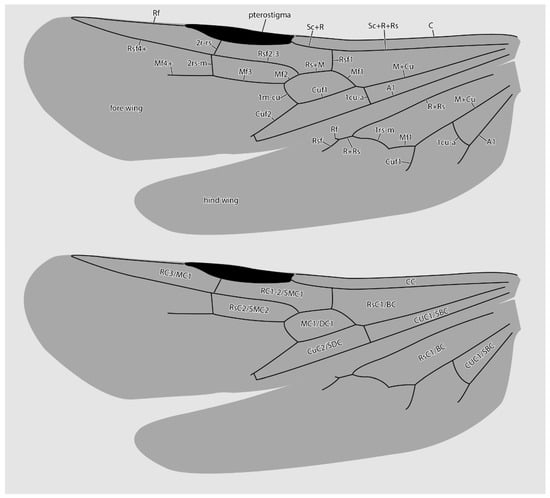 Diagrammatic representations of wing venation (top) and cell identities (bottom) based on the MAIG 6016 paratype 1 of †Desyopone hereon gen. et sp. nov. Cell names: CC = costal cell; RC1-2/SMC1 = first and second radial cells or submarginal cell 1; RC3/MC1 = third radial or first marginal cell; MC1/DC1 = first medial or first discal cell; RsC2/SMC2 = second sectorial or second submarginal cell; CuC1/SBC = first cubital or first subbasal cell; CuC2/SDC = second cubital or first subdiscal cell.