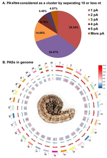 To analyze the global distribution of APA in Spodoptera frugiperda, the gene annotation information of Spodoptera frugiperda was downloaded (http://v2.insect-genome.com/Organism/715, accessed date: 1 March 2022) [32]. We compared the CS position with the gene location on the chromosome, and the gene containing two or more cleavage sites means the gene was potentially regulated by alternative polyadenylation. After this, the gene containing the PAS number was analyzed.