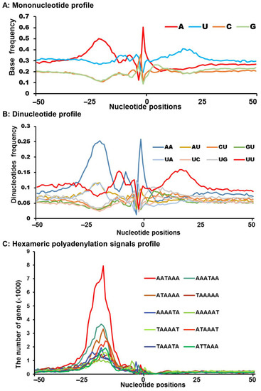 Because in many eukaryotes CA and UU/GU were abundant at positions −1 and 0 and 15–30 bp 3′ of the cleavage site, respectively [8,10], we analyzed 16 types of dinucleotide profiles of the 50,616 pA sites within 100 bp upstream and downstream of their cleavage sites (Figure 2B and Figure S1A). Moreover, AA-enriched positions were comparable to single nucleotide A in tendency, according to the dinucleotide profiles (Figure 2B and Figure S1A). In addition, the AA rich region showed an excessive expression with a frequency of >0.08 from position 23–100, while other dinucleotide such as AC, AG, and AU had no significant tendency (Figure S1A). What is more, the region −1 to 1 occurred a sharp CA peak and proved that it was a cleavage site. However, the CC, CG, and CU had no such condition. Although the tendency of the GA was similar to that of the CA, it has a smaller proportion. Meanwhile, a sharp peak for UA appeared in the region of −1 to 1, and a slightly wider peak appeared in the region of −14 to −24. In accord with the downstream U/GU-rich element, the UU rich significantly occurred at regions from −4 to −13 and 10 to 26, with a focus on 14 to 22. Moreover, the frequency of the remaining dinucleotides at positions 1–100 was between 0.03 and 0.08, which appeared random (Figure 2B and Figure S1A).