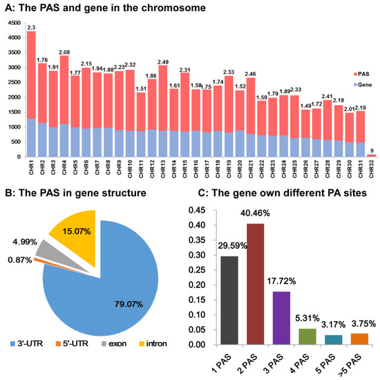 The PAS positions in the chromosome were obtained by extracting the mapped data of the poly(A) tail reads. Next, the gene number in each of the 32 chromosomes was then extracted using the genome annotation file, and PAS in different gene positions were also examined.