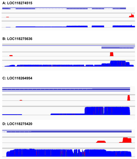Variable tailing can be divided into many types according to different positions of genes. Some will change the protein sequence, and some will not change the protein sequence but will change the RNA regulatory elements. We selected four genes (gene number: LOC118274515, LOC118275636, LOC118264954, LOC118275420) to explore the regulation of variable tailing on genes. LOC118274515, a short chain specific acyl CoA dehydrogenase, has a variable tailing site in the 5′UTR, primarily one in the 3′UTR. If the variable tailing of 5′UTR is mainly used, this gene will only transcribe some non-coding transcripts (Figure 5A). LOC118275636 was most likely peroxisomal acyl-coenzyme A oxidase 1, whose first pA site was in the ORF, the second in the 3′UTR (Figure 5B). If it mainly uses the first tailing site, the protein sequence will be shortened, which may change the function of the protein. LOC118264954 was found to be cadherin-related tumor suppressor-like, whose first pA site is in an intron, and another one is in 3′UTR (Figure 5C). If it mainly uses the first tailing site, the protein sequence will be shortened, which may change the function of the protein. LOC118275420 was Acyl-CoA dehydrogenase (Figure 5D). Both pA sites were in 3′UTR. Its variable tailing does not lead to different protein sequences, but it contains many regulatory elements, such as miRNA recognition sites, in order to alter the length of 3′UTR.