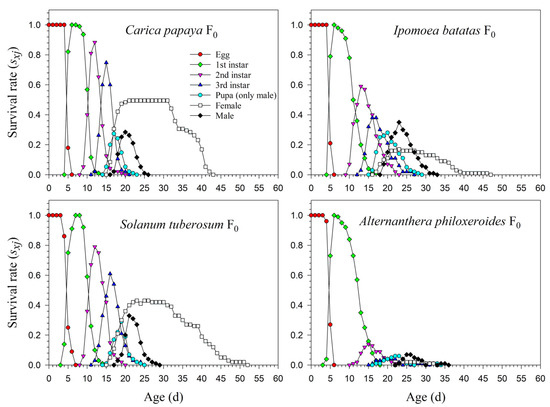 By using the age-stage, two-sex life table, He et al. (2021) reported a longer developmental duration and lower intrinsic rate of increase for Spodoptera frugiperda (J. E. Smith) (Lepidoptera: Noctuidae) when reared on soybean, while a shorter developmental duration and higher intrinsic rate occurred on sunflower [36]. Karimi-Pormehr et al. (2018) reported a shorter developmental time, higher survival rate, and greater fecundity in Sitotroga cerealella (Olivier) (Lepidoptera: Gelechiidae) on a more suitable cultivar (‘19A1′) of barley, while noting a longer developmental time and lower fecundity when reared on a less suitable cultivar (‘Fajr30′) [37]. In this study, when P. marginatus was reared on C. papaya, the developmental durations of the 1st, 2nd, and 3rd instar (female) individuals were significantly reduced (Supplementary Table S1); however, the reverse occurred when reared on I. batatas and S. tuberosum. While the fecundity of P. marginatus was significantly higher on C. papaya overall in this study, it was significantly lower on I. batatas (F0). The insects have trade-offs between development and reproduction. When the basic ‘development’ need of insects are met by suitable host plants, insects tend to allocate more energy to reproduction.