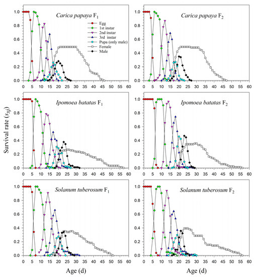 Egg masses laid within a 24 h period on potato leaves were randomly selected for the life table study. In order to accurately observe the lifespan of each insect, the eggs were placed on leaves of C. papaya, I. batatas, S. tuberosum, or A. philoxeroides in plastic dishes (3.5 cm in diameter and 2.0 cm in height) containing agar (3%). After hatching, each 1st instar was transferred into a fresh dish containing leaves of the same plant and reared individually. Following the advice of Mou et al. (2015), only hatched eggs were used in the life table studies to accurately estimate the life table parameters [14]. Newly emerged adult males and females were paired. The daily fecundity and survival were recorded until the death of all individuals. The life table data for three consecutive generations (F0, F1, and F2) were recorded. Paracoccus marginatus reared on A. philoxeroides only survived for a single generation (F0); therefore, only one life table could be constructed for insects on this host.