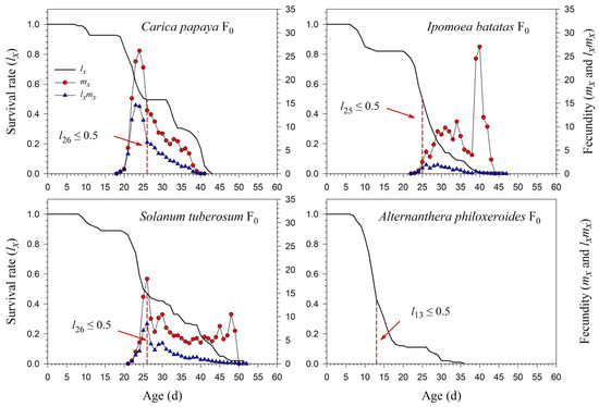 Age-specific survival (lx), fecundity (mx), and net maternity (lxmx) rates of Paracoccus marginatus individuals reared on four different host plants (F0). The red vertical dashed lines in the figure denote the age at which the survival rate lx ≤ 0.5.