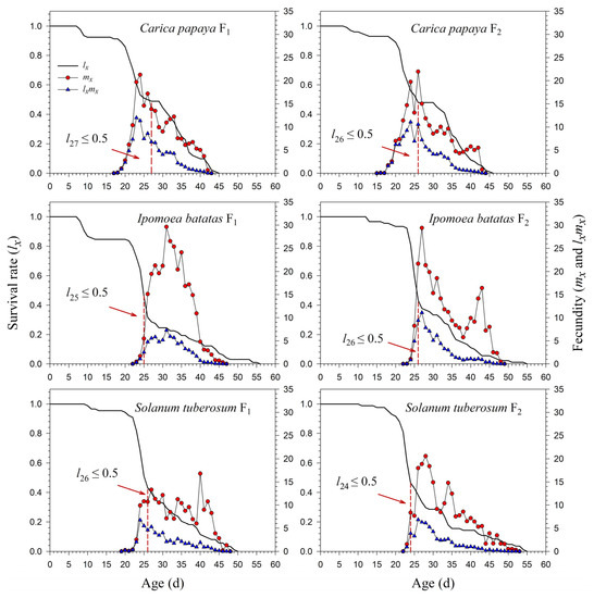 The age-specific survival rate (lx) curve is the simplified version of sxj; thus, the stage differentiation is not observable. The 50% survival rates of P. marginatus in F0 occurred at 26, 25, 26, and 13 d on C. papaya, I. batatas, S. tuberosum, and A. philoxeroides, respectively (Figure 3). In F2, the 50% survival rates of P. marginatus on I. batatas and S. tuberosum changed at 26 and 24 d, respectively (Figure 4). Higher curves of the age-specific fecundity (mx) and net maternity (lxmx) were observed on C. papaya in F0. Although there was a relatively high peak of 27 eggs at 40 d on I. batatas, the low survival rate (lx) caused the net maternity rates (lxmx) to be very low. When reared on S. tuberosum, the high peak of mx (18.4 eggs) occurred at 26 d, and the remaining mx values were, for the most part, greater than 5 eggs (Figure 3). The mx and lxmx values on C. papaya and S. tuberosum did not change significantly; they did, however, increase on I. batatas during the F1 and F2 generations (Figure 4).