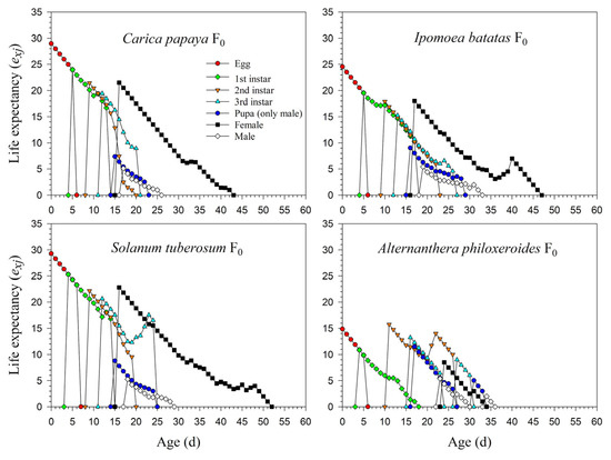 The age-stage-specific life expectancy (exj), i.e., the length of time that an individual of age x and stage j is expected to survive, was calculated according to Chi and Su (2006) [24]: