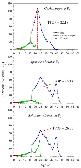 The age-stage-specific reproductive values (vxj) at age zero were exactly equal to the finite rates of increase (λ), i.e., 1.1945, 1.0970, and 1.1475. The vxj increased with age. When reared on I. batatas in F0, the vxj curve significantly increased when female adults emerged. Similar increases in the vxj curves were observed on C. papaya and S. tuberosum; due to the high percentage of female adults, however, this increase was not obvious. The peak dates of vxj were close to the total preoviposition period (TPOP) (Figure 6). The detailed vxj curves on C. papaya, I. batatas, and S. tuberosum for F1 and F2 are shown in Supplementary Figure S2.