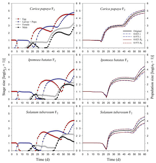 Our results showed that P. marginatus reared on C. papaya had a significantly higher proportion of female adults (Nf/N), while a lower Nf/N occurred on I. batatas in the F0 generation. Lewontin (1965) demonstrated that the first age of reproduction plays an important role in the values of r and λ [38]. When P. marginatus was reared on C. papaya, reproduction in the F0 generation started at 18 d, but advanced to 15 d in F2. The three-day change resulted in the value of r increasing from 0.1778 d−1 (F0) to 0.1824 d−1 (F2), while λ increased from 1.1945 d−1 (F0) to 1.2000 d−1 (F2) (Figure 4 and Figure 5). Consequently, this change resulted in P. marginatus reared on C. papaya having higher values for their population parameters (r and λ) due to their higher survival and fecundity rates on this host. The opposite was true when reared on I. batatas and S. tuberosum.
