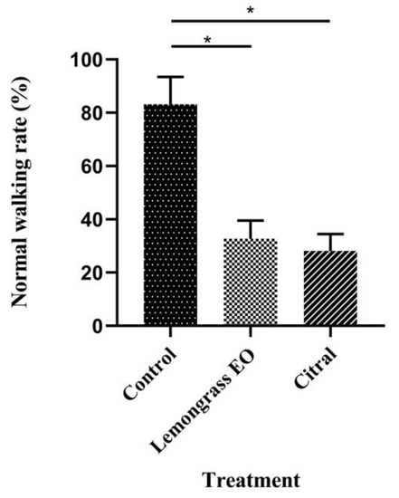 Toxicity data were subjected to probit analysis in order to estimate the LC50 values of lemongrass EO and the major constituent. The mortality rate, chitin content, and walking and gripping ability data were subjected to one-way ANOVA and Tukey’s HSD test (p < 0.05).