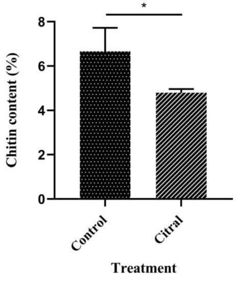 In the present study, the chitin content in the control and citral-treated groups of R. flaviceps workers was investigated. As shown in Figure 3, citral (2.91%) led to significantly lower chitin content in R. flaviceps workers, compared with the control (6.67%; p < 0.01), indicating that citral decreased the chitin content.