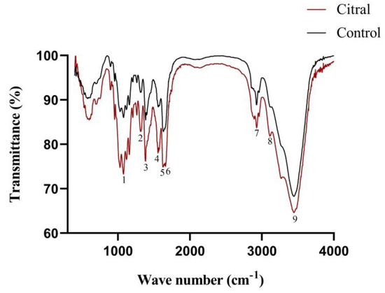 FTIR spectra of α-chitin from R. flaviceps in the control and citral-treated groups.