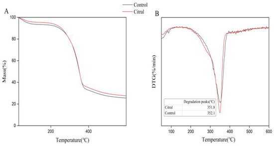The thermal stability and degradability of chitin were analyzed by thermogravimetric analysis (TGA; Figure 5). As shown in Figure 5A, three degradation processes occurred: the first one occurred at 30–110 °C, with a weight loss of 5.5%. The second degradation process occurred at 280–370 °C; the degradation rate in this process was accelerated, and the weight loss was 67.8%. Finally, the third degradation process occurred at 403–500 °C, and the degradation tended to be stable in this process. Figure 5B shows the maximum degradation rates of chitin content by citral. The DTGmax of control chitin was at 352.1 °C, while the DTGmax of citral-treated chitin was at 351.8 °C, indicating that the thermal stability of chitin was affected by citral treatment.