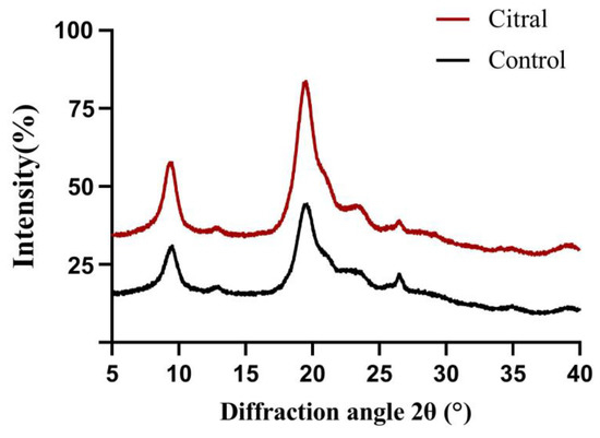 The α-crystalline structure of chitin samples was analyzed by X-ray diffraction. As shown in Figure 6, the crystal reflection peaks were located at 9 and 19°. The chitin crystallinity indices of the control and citral-treated samples were 60.8 and 41.2%, respectively. The results indicate that citral destroyed the chemical structure of chitin to varying degrees.