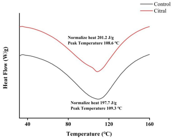 The thermal stability of the chitin samples was analyzed by differential scanning calorimetry. As shown in Figure 7, the heat value of the control group was 201.2 J/g, which was significantly higher than that of the treatment group. The maximum decomposition temperature was 109.3 °C in the control group and 108.6 °C in the citral-treated group. These results indicate that treatment with citral changed the thermal stability of chitin, which was consistent with the results of the previous two tests.