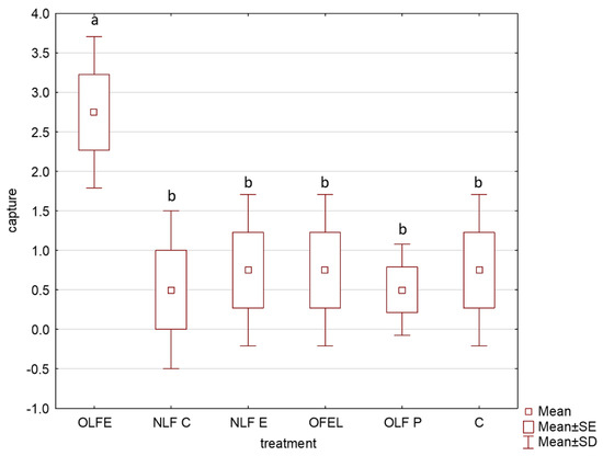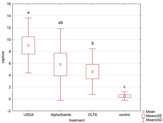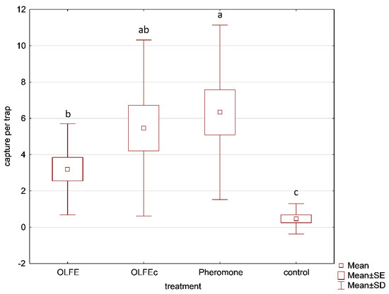 Number of male CPB captured with OLFE (Eppendorf formulation), two sources of pheromone lure (USDA and Alpha Scents, Inc.), and unbaited control traps in a four-week field test. Ten replicates per treatment were used in this experiment. Boxes presenting different letters are significantly different.