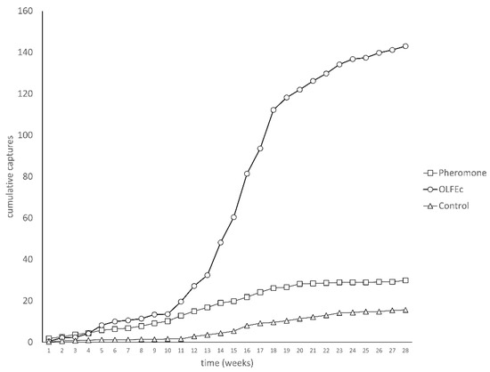 In Experiment 5, the concentrated OLFE started to capture significantly more males than the pheromone lures and the unbaited traps at week 5 (H2,15 = 9.129; p = 0.010) until week 28 (almost 7 months) (glm, F(2,48.21), p=0.000). Over the 28-week test, OLFEc attracted an average of 143.0 ± 24.4 males per trap compared with 29.6 ± 3.5 males for the pheromone lures and 15.6 ± 5.0 males for the unbaited trap (H2,15 = 12.522, p = 0.002) (Figure 4). Lures were not replaced in this experiment. A total of 941 insects were captured in this experiment.