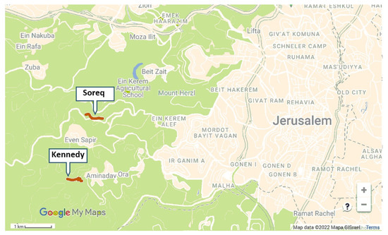 A map showing the locations of the Soreq and Kennedy study sites transects (red bold lines) relative to the western neighborhoods of Jerusalem. (Beige shading—built areas, green shading—open areas).