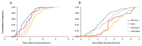 Flower visitation of bees from each category as a function of time after sunrise: (A) visitations to pollen-providing flowers and (B) visitations to nectar-providing flowers. The vertical axis presents the cumulative frequency of bee numbers for both 2013 and 2014.