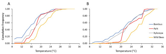 Flower visitation of bees from each category as a function of the ambient temperature (A) on pollen-providing flowers and (B) on nectar-providing flowers. The vertical axis presents the cumulative frequency of bee numbers recorded during 2013 and 2014.
