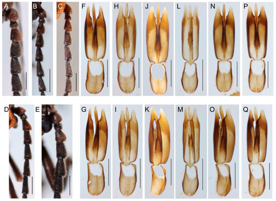 (A–C,F–K) Dictyoptera aurora and (D,E,L–Q) D. coccinata. (A–E) Antennomeres 1–6; (F–Q) Male genitalia, dorsal (upper row), and ventrolateral views (bottom row). Each column of the genitalia figures contains two views of the same individual. Scales: 0.5 mm.