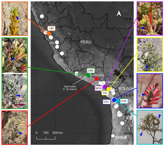 - Farfán, J.; Cerdeña, J.; Vargas, H.A.; Gonçalves, G.L.; Lamas, G.; Moreira, G.R.P. A peculiar new species of Dione (Agraulis) Boisduval & Le Conte (Lepidoptera: Nymphalidae: Heliconiinae) associated with Malesherbia Ruiz & Pavón (Passifloraceae) in xeric western slopes of the Andes. Zookeys 2022, 1113, 199–227. [Google Scholar]