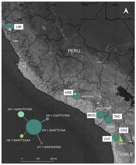 - Bandelt, H.J.; Forster, P.; Röhl, A. Median-joining networks for inferring intraspecific phylogenies. Mol. Biol. Evol. 1999, 16, 37–48. [Google Scholar] [CrossRef]