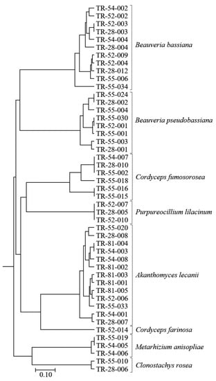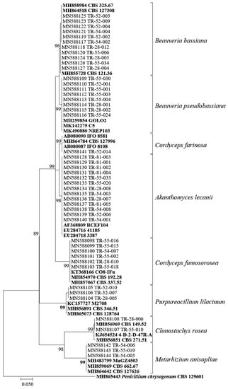 The DNA sequences were edited, and consensus sequences were estimated manually using MegaX software [31]. All of the sequences were compared against the GenBank nucleotide database (https://www.ncbi.nlm.nih.gov/genbank/, accessed on 1 July 2022) using the BLASTn algorithm. All of the generated sequences of the EPF isolates were deposited in GenBank. GenBank provided the accession numbers of the submitted sequences, as shown in Table 1. The phylogenetic relationships of all of the newly generated sequences of the EPF isolates that were obtained in this study, the reference sequences retrieved from GenBank, and Penicillium chrysogenum (CBS 129601) as a monophyletic outgroup were investigated, on the basis of ITS sequences. DNA sequences were aligned, using the Clustal W program [32] and the MEGA7 software package [33]. The phylogenetic tree was inferred, using the maximum likelihood method based on the Tamura-Nei model, which was applied to the whole set of the aligned sequences. The confidence of the branching was calculated by bootstrap analyses (1000 replicates).