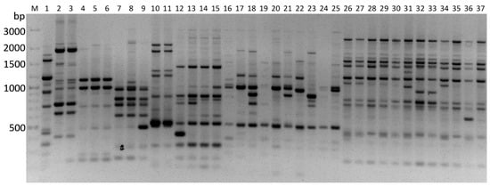 The band profiles with PBS primer (2395) for entomopathogenic fungal isolates. M: GeneRuler 100 bp Plus DNA Ladder (Thermo Fisher Scientific, Waltham, MA, USA). 1: Cordyceps farinosa, 2–3: Metarhizium anisopliae, 4–6: Cordyceps fumosorosea, 7–9: Purpureocillium lilacinum, 12–15: Beauveria pseudobassiana, 16–25: Beauveria bassiana 26–37: Akanthomyces lecanii.