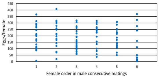 No significant differences among females were observed in their lifetime fecundity (F = 1.64, df = 5/109, p > 0.05) (Table 1). However, a trend toward lower fecundity was observed in the sixth female. Figure 1 represents the total fecundity of each individual female according to mating order. There is little variation in fecundity among females depending on which order was copulated by the male. However, there was much variation among the individual females within each order. For example, females mated first (by a virgin male) had a fecundity of 7 to 366 eggs/female, and females mated second from 19 to 409 eggs/female. Despite this high variation, it is appreciated that for females mated from first to fifth place, few females laid below 50 eggs (one or none), but there were up to 8 females with low oviposition in the females mated in sixth place.