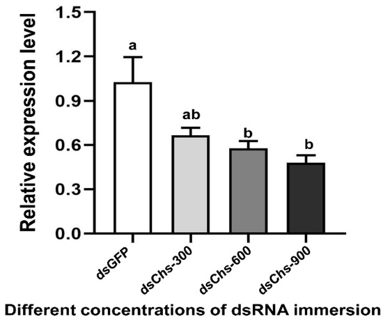 Relative expression levels of CHS2 under immersion treatments with different concentrations of dsRNA. The data are denoted as the mean ± the SE. One-way analysis of variance (ANOVA) was used to analyze the relative expression levels of CHS2 under different treatments. Different lowercase letters indicate significant differences among different temperature treatments. Tukey’s multiple range test was used for pairwise comparison for mean separation (p < 0.05).