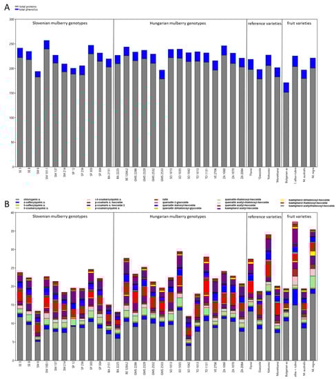 The results of biochemical analyses of the total proteins, total phenolics and individual phenolic components in leaves are presented in Figure 1A,B and Supplementary Table S2. The highest total protein content was determined in genotype SM 101.1 (239.42 mg/g DW), the lowest in the Bulgarian fruit genotype. Phenolics were the highest in M. alba × rubra (21.51 mg/g DW) and the lowest in Slovenian genotype SM 6 (11.26 mg/g DW) (Figure 1A, Supplementary Table S2).