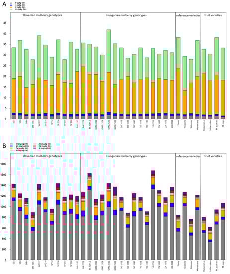 3.1. Chemical Composition of the Leaves of Selected Slovenian and Hungarian Mulberry Genotypes, Reference Sericultural and Fruit Varieties