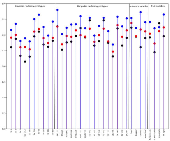 The significant highest amount of total phenolics was observed in classical contemporary sericultural genotypes and fruit varieties. In Table 1 predominant individual phenolics are summarised as mean values of Slovenian, Hungarian local genotypes, reference sericultural, and fruit varieties, whereas the ranges of all analysed phenolics of individually selected mulberry genotypes are presented in Supplementary Table S2. The least mean content of chlorogenic acid was found in Slovenian genotypes, the most in fruit varieties. Similarly, the highest amount of 4-caffeoylquinic acid was found in fruit varieties. The highest amount of rutin was analysed in reference and Hungarian genotypes of M. alba, the lowest in fruit varieties. Reference sericultural genotypes and fruit varieties have the highest amount of quercetin-3-glucoside, the least concentration was determined in Slovenian genotypes of mulberry trees. The highest amount of quercetin malonyl-hexoside was found in the leaves of Hungarian and reference mulberry trees, the lowest in fruit varieties (Table 1, Supplementary Table S2).