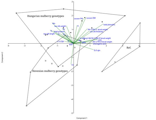 The chemical traits of mulberry leaves, silkworm weight (5–7th day/5th instar), cocoon weight (fresh), silk thread parameters, and reeling wastes were presented by means and SD and were statistically evaluated by one-way analysis of variance (ANOVA), followed by post-hoc comparison according to Duncan. Letters describe significant differences among genotypes and origin-dependent genotype groups.