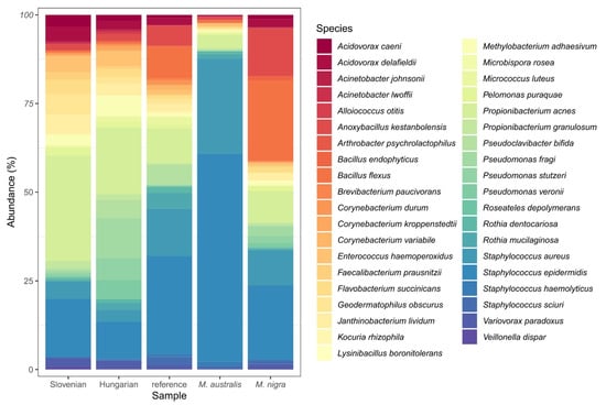 Three randomly selected, healthy 5th instar larvae were collected from groups fed with Slovenian and Hungarian mulberry genotypes, reference varieties, M. australis, and M. nigra. The guts of larvae from each pool were removed, homogenized, and total DNA was extracted. The DNA samples were submitted to a metagenomic investigation targeting the 16S rRNA gene of bacteria to reveal the bacterial gut microbiomes of silkworms, fed with different genotypes and species of mulberry leaves.