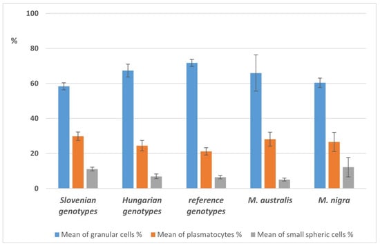 For the description of the immune cells, 10 fifth instar larvae were collected from different experimental groups. Haemolymph was collected by cutting a proleg into Schneider’s insect medium supplemented with 5% foetal bovine serum and phenylthiourea. Tenfold dilution of the haemolymph in the same medium was used to determine total cell count in a Bürker counting chamber and 30 μL aliquots of the diluted cell suspensions were placed on the spots of Hendley Essex—Diagnostic Microscope Slides for phenotype analysis. The haemocytes were allowed to settle and adhere to the slide for 60 min in a humidity chamber. After the one-hour incubation, the haemocytes were fixed with acetone for six minutes and were classified according to morphological criteria [25,26]. The proportions of three main haemocyte classes, the granular cells, the plasmacytes, and the prohemocytes were determined.