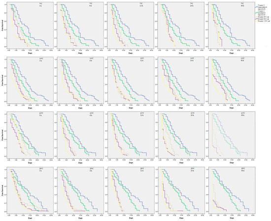 The survival probability of gamma-sterilized male Ae. aegypti was reduced by all factors of the treatments, i.e., density, temperature, and duration (Figure 1). The mean longevity of the treatment groups was significantly reduced compared with both unirradiated–unpacked and irradiated–unpacked controls. Among the packaging and simulated transportation treatments, the mean longevity ranged from 3.05 ± 0.3 to 6.87 ± 0.43 days, 3.23 ± 0.39 to 6.72 ± 0.49 days, 1.48 ± 0.14 to 7.77 ± 0.49 days, and 1.43 ± 0.14 to 8.04 ± 0.73 days at temperatures of 7, 14, 21, and 28 °C respectively (Table S1). In general, longevity was significantly reduced with increasing density, temperature, and duration of the treatment (log-rank test, p < 0.05) (Table S1). In addition, longevity at densities of between 40 and 80 males/2 mL with lower temperatures (7 and 14 °C) and the same duration showed no significant difference, except for durations of 12 h and 48 h at temperatures of 7 and 14 °C, respectively.