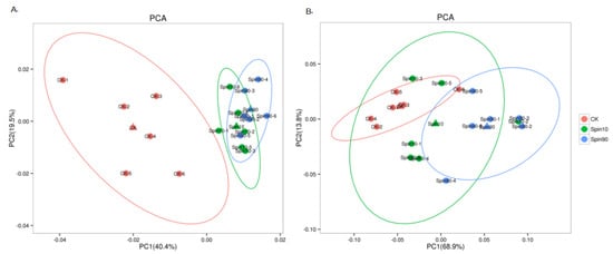 Metabolic profile in S. frugiperda exposed to sublethal and lethal dose of the spinetoram. (A) Principal component analysis (PCA) model of Spin10, Spin 90, and Control at pro-model, (B) partial least squares-discriminant analysis (PLS-DA) model of Spin10, Spin90, and Control at neg-model.