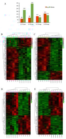 For transcriptome profiling, three treatments: Control (CK), Spin-10 (LC10), and Spin-90 (LC90), in four replicates at 48 h post S. frugiperda stress were used to construct 12 cDNA libraries. A total of 83.29 Gb clean data was obtained and the Q30 base percentage was 93.03% and above. Clean reads were aligned with a designated reference genome (assembly ZJU_Sfru_1.0) and the comparison efficiency ranged from 82.35 to 84.17% (Table 1). To evaluate biological replicate correlation in control and different doses, we analyzed Pearson’s correlation coefficient analysis among all treatments (Figure 1A). The abundance of down-regulated genes was higher than up-regulated genes as compared to control at LC10 dose (Figure 1B), among them, 1627 unigenes were up-regulated and the remaining 1831 unigenes were down-regulated. However, the abundance of genes was reversed compared to control at LC90 dose (Figure 1B,C), among them, 1804 unigenes were up-regulated and the remaining 1580 unigenes were down-regulated. The color difference indicates high (red) and low (green) expressions.