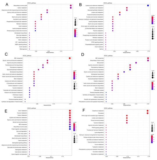 Summary of pathway analysis. (A) Pathway analysis of LC10 and control groups at neg-mode. (B) Pathway analysis of LC90 and control groups at neg-mode. (C) Pathway analysis of LC10 and control groups at pos-mode. (D) Pathway analysis of LC90 and control groups at pos-mode. (E) Pathway analysis of LC10 and LC90 groups at neg-mode. (F) Pathway analysis of LC10 and LC90 groups at pos-mode. The color and size of the shapes represent the regulated degree of the pathways by the treatment of doses of the spinetoram; larger, red shapes indicate a greater effect on the pathway.