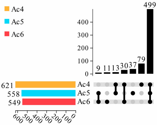 In total, 621, 558, and 549 piRNAs were identified in the Ac4, Ac5, and Ac6 groups, respectively. In addition, 499 piRNAs were shared by the aforementioned three groups, whereas the quantities of specific ones equaled 79, 37, and 11, respectively (Figure 1).