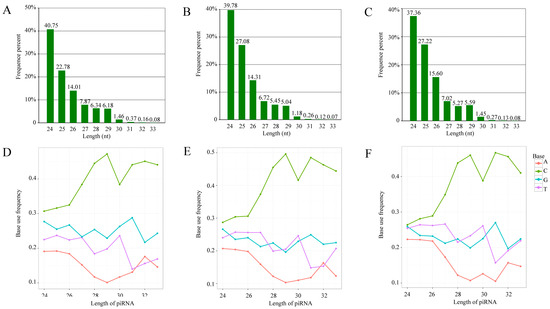 The structural analysis indicated that the length distribution of the identified A. c. cerana piRNAs in the abovementioned three groups was from 24 nt to 33 nt (Figure 2A–C); additionally, the first bases of the piRNAs in the Ac4, Ac5, and Ac6 groups had a C bias (Figure 2E,F).