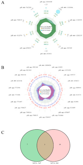 Radar maps and Venn diagram of DEpiRNAs. (A) Radar map of DEpiRNAs in the Ac4 vs. Ac5 comparison group. (B) Radar map of DEpiRNAs in the Ac5 vs. Ac6 comparison group. (C) Venn analysis of DEpiRNAs in Ac4 vs. Ac5 and Ac5 vs. Ac6 comparison groups. There were three up-regulated piRNAs that were shared by the above-mentioned two groups.