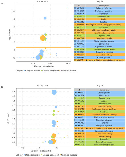 In comparison, 21 DEpiRNAs in the Ac5 vs. Ac6 comparison group were detected to target 28,969 mRNAs, which could be annotated to 20 function terms relative to biological processes such as cellular process and localization, ten terms that were relevant to molecular functions such as transporter activity and molecular function regulator, and 16 terms that were related to cellular components such as synapse part and synapse. (Figure 4B).