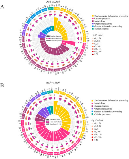 KEGG pathways annotated by target mRNAs of DEpiRNAs. (A) Pathways annotated by DEpiRNA-targeted mRNAs in the Ac4 vs. Ac5 comparison group; (B) Pathways annotated by DEpiRNA-targeted mRNAs in the Ac5 vs. Ac6 comparison group. From outside to inside, the first circles indicate the enriched terms. The second circles indicate the numbers of targets that were enriched in this term in the background gene as well as the p-values, the redder the color, the larger the gene number and the smaller the p-value. The third circles indicate the bar charts of the proportion of up-regulated or down-regulated targets, dark purple represents the proportion of up-regulated targets, while light purple represents the proportion of down-regulated targets. The fourth circles indicate the setting standard for the numbers of targets, different colors represent different terms. Rich factor means the number of foreground targets that were enriched in this term divided by the number of background genes.